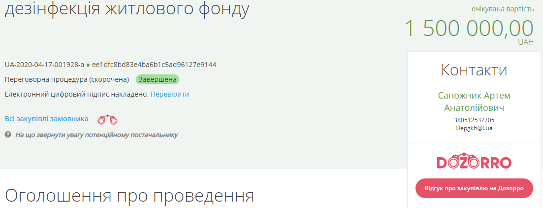 Информация об этом опубликована в системе публичных закупок ProZorro.