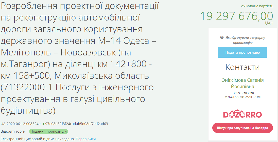 Служба автодорог 12 июня объявила торги на разработку проектной документации на реконструкцию автомобильной дороги общего пользования государственного значения М-14 Одесса — Мелитополь — Новоазовск на участке км 142+800 - км 158+500 (15,7 км) с ожидаемой стоимостью 19 миллионов 297 тысяч 676 гривен.