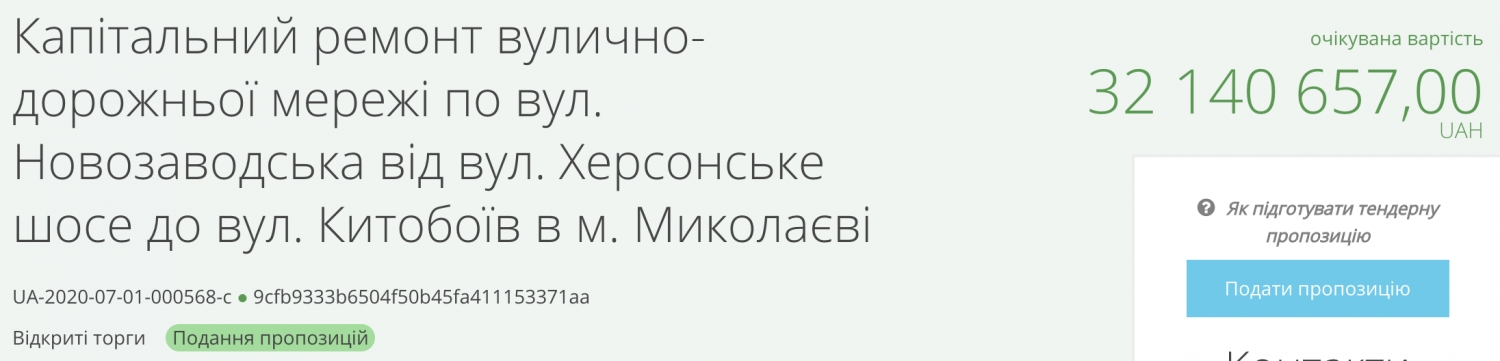 Как известно, что 22 мая 2020 года Департамент ЖКХ объявил торги на ремонт Новозаводской (от улицы Херсонское шоссе до улицы Китобоев) с ожидаемой стоимостью в 32 миллиона 140 тысяч гривен. В тендере участие приняли две фирмы: ООО «ЭНЕРГО-РОСТ» с предложением в 32 миллиона 135 тысяч гривен и ООО «БВК Пик-Строй» с предложением в 32 миллиона 140 тысяч гривен, однако предложения участников были отклонены.