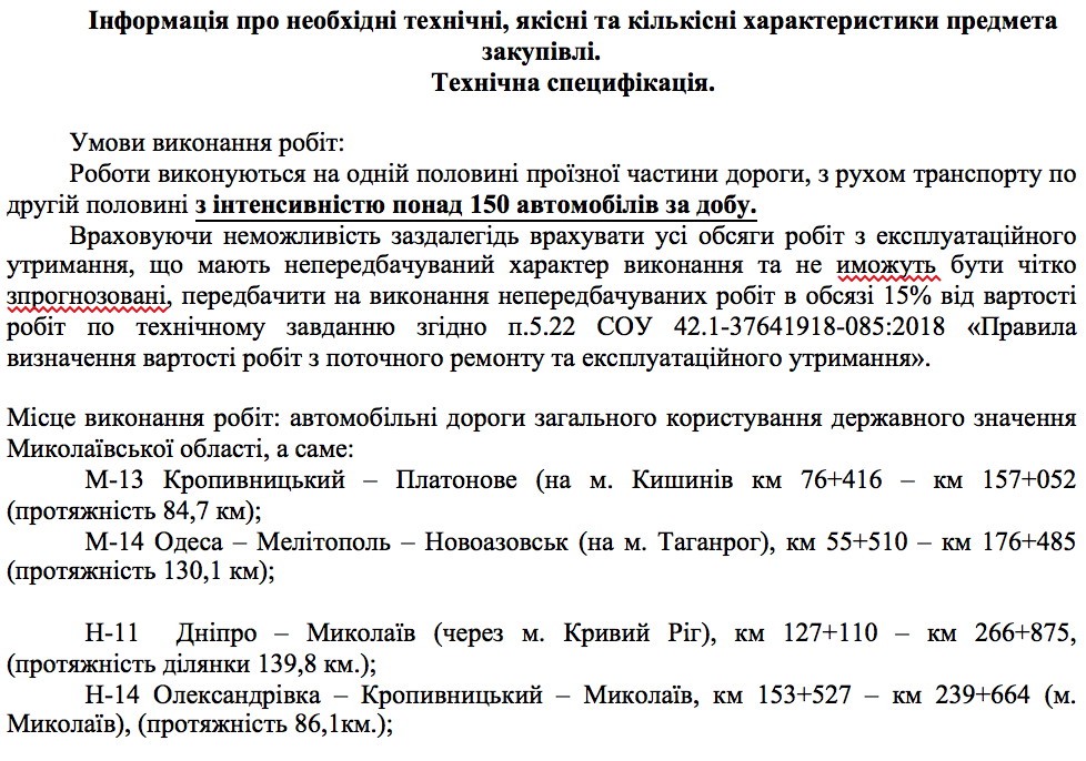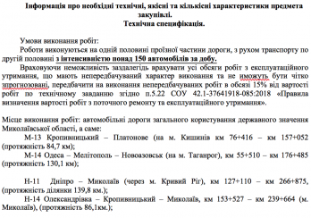 Согласно данным ресурса, чиновники объявили торги с ожидаемой стоимостью работ в 251 миллион 685 тысяч 137 гривен. Предполагается, что за эту сумму подрядчик до 31 декабря 2020 года выполнить работы по эксплуатационному содержанию автомобильных дорог общего пользования государственного значения Николаевской области.