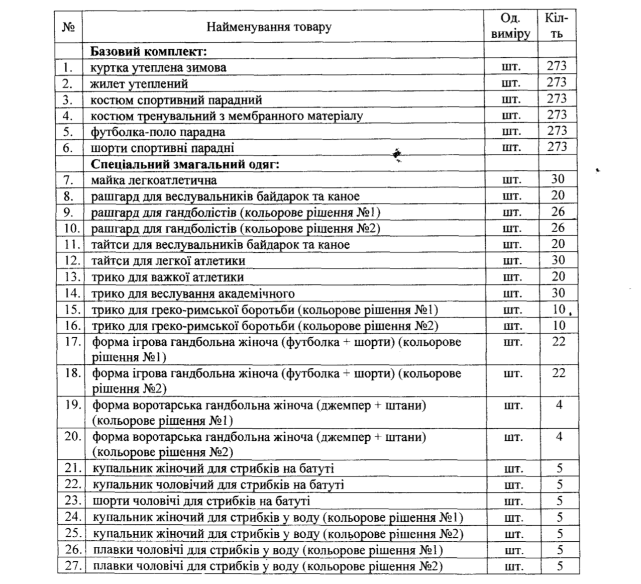 Согласно данным ресурса чиновники ОГА 17 августа 2020 года объявили закупку спортивной экипировки на ожидаемую сумму в 3 миллиона гривен. Предполагалось, что за эту сумму подрядчик должен был предоставить 273 штуки базового комплекта формы (куртка утепленная зимняя, жилет утепленный, костюм спортивный парадный, костюм тренировочный из мембранного материала, футболка поло парадная, шорты спортивные парадные), 20 штук рашгардов для гребцов байдарок и каноэ, 52 штуки рашгардов для гандболистов, 20 штук тайтсов для гребцов байдарок и каноэ, 30 штук тайтсов для легкой атлетики, 20 штук трико для тяжелой атлетики, 30 штук трико для академической гребли, 44 штуки формы игровой гандбольной женской, 8 штук вратарских комплектов для женского гандбола, 20 штук трико для греко-римской борьбы, в двух цветовых решениях, 30 легкоатлетических маек, 5 штук купальников женских для прыжков на батуте, 5 штук купальников мужских для прыжков на батуте, 5 шортов мужских для прыжков на батуте, 10 штук купальников женский для прыжков в воду, 10 штук плавок мужских для прыжков в воду.