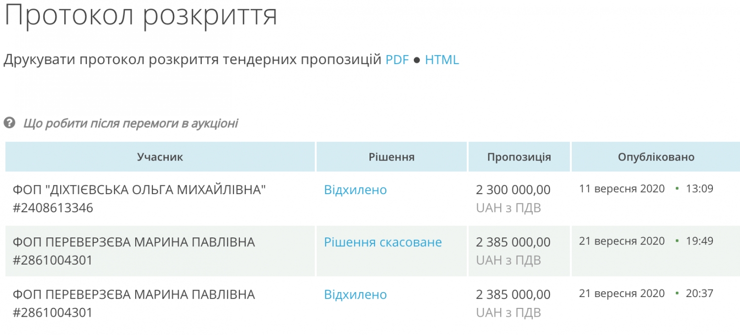 На участие в аукционе свои документы подали две предпринимательницы: Ольга Дихтиевская, которая запросила за выполнение заказа 2 миллиона 300 тысяч гривен и Марина Переверзева, которая согласилась пошить форму за 2 миллиона 385 тысяч гривен.