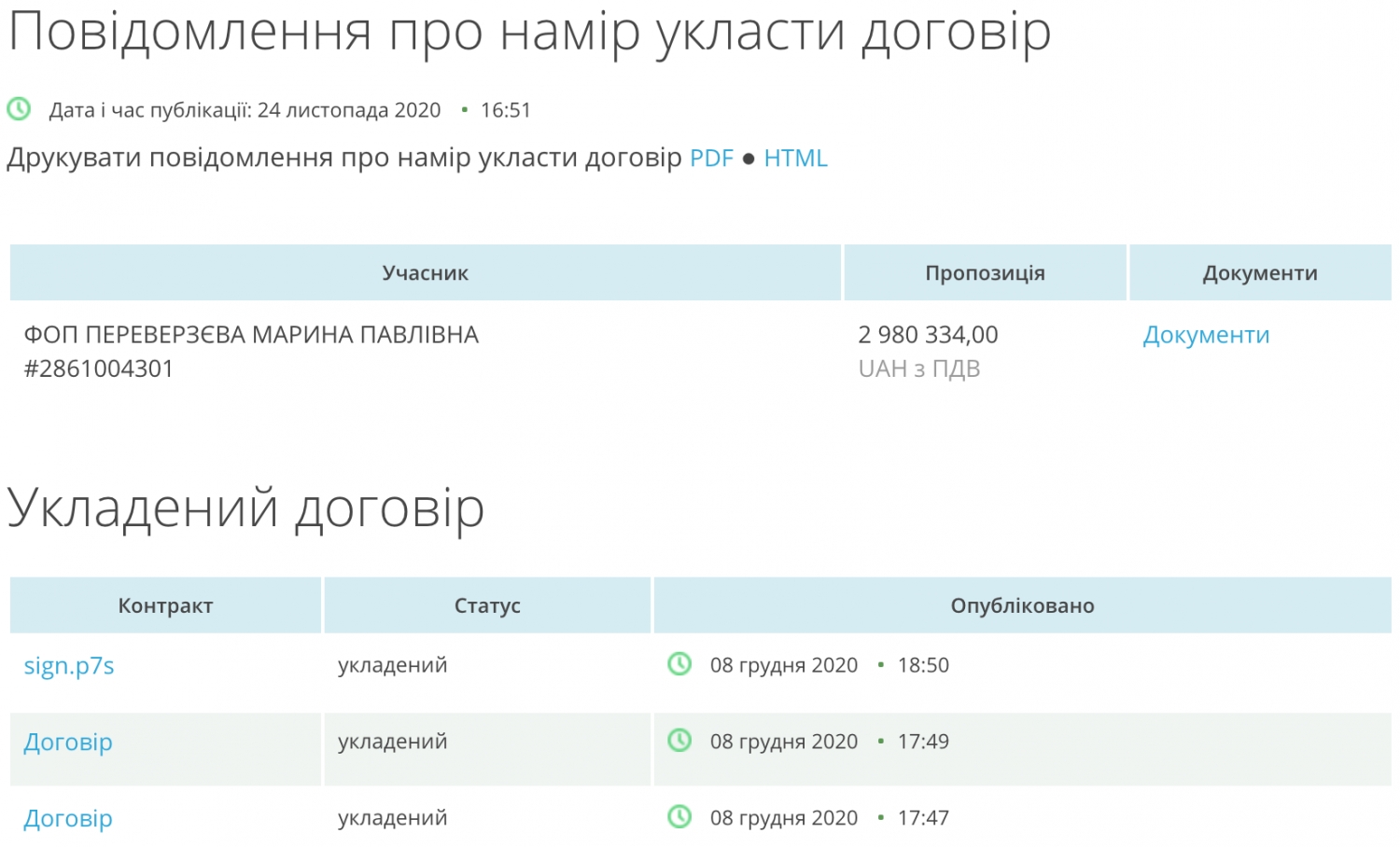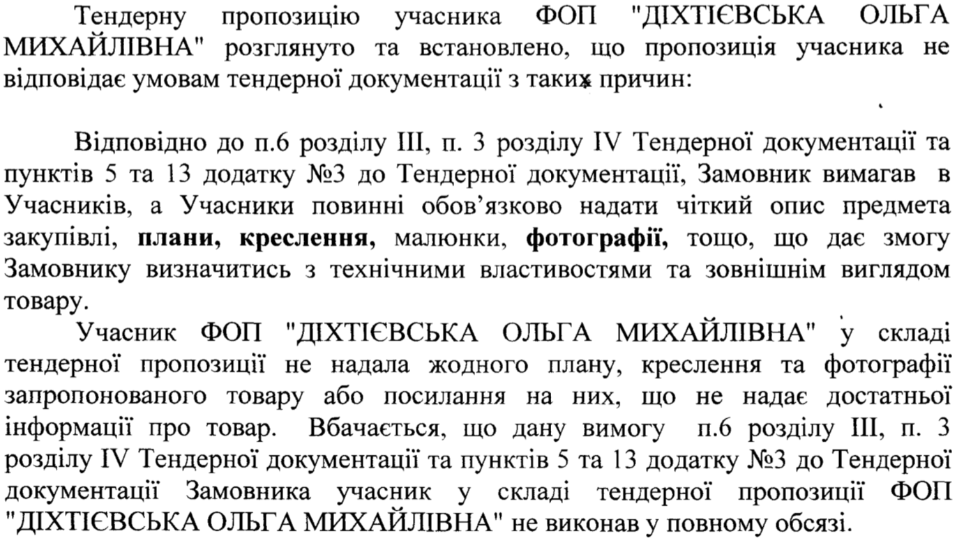 Примечательно, что в ходе рассмотрения наиболее выгодного предложения, которое сделала Ольга Дихтиевская, тендерный комитет принял решение не заключать с ней договор по той причине, что в своем пакете документов она не предоставила фотографии примеров пошитой формы. Чиновники отметили, что это не дало им возможности оценить качество, предлагаемое товара.
