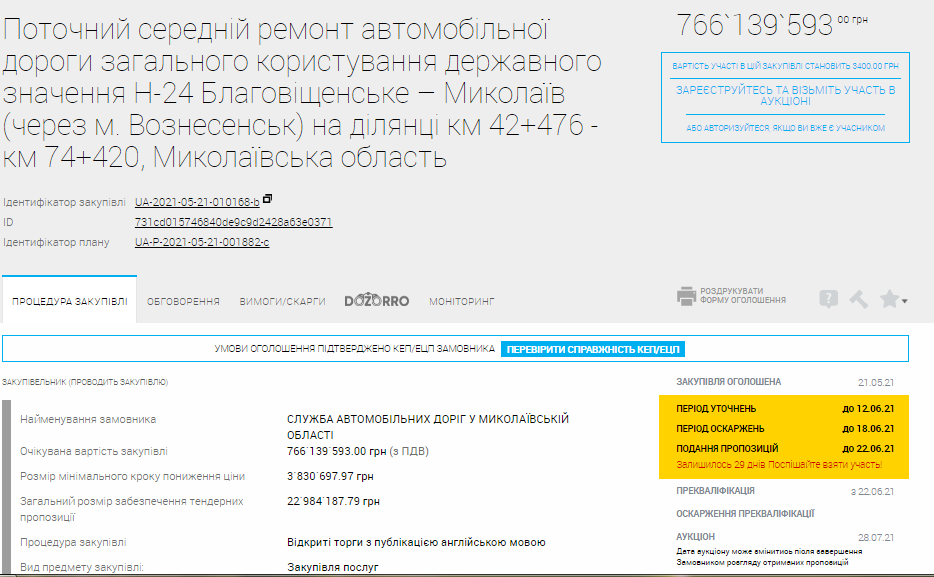 Предполагаемая стоимость работ — 766 миллионов 139 тысяч 593 гривны, говорится на сайте Госзакупок.