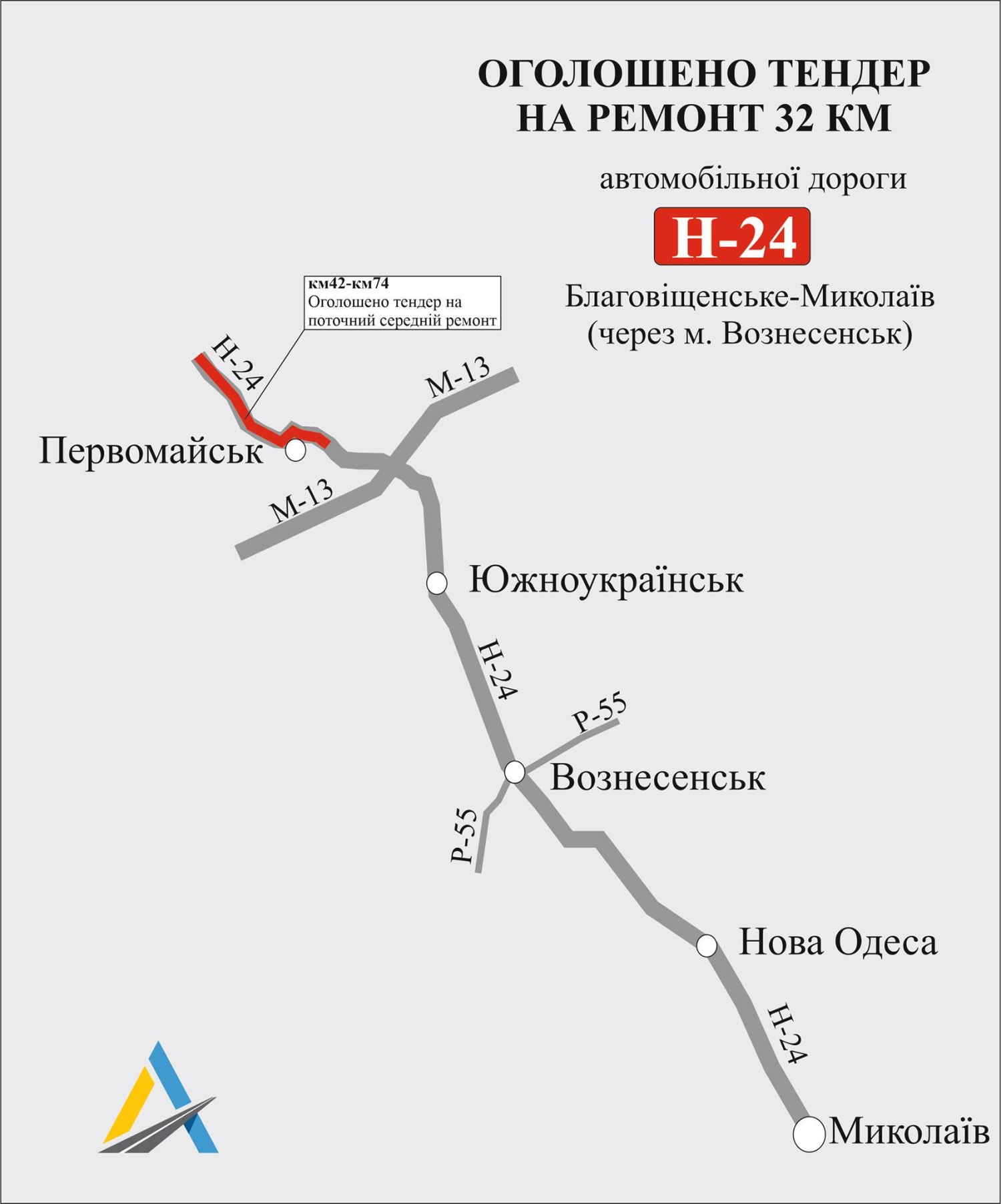 Служба автомобильных дорог в Николаевской области 21 мая объявила тендер на ремонт 32-километров трассы Н-24 Благовещенское-Николаев (через город Вознесенск).