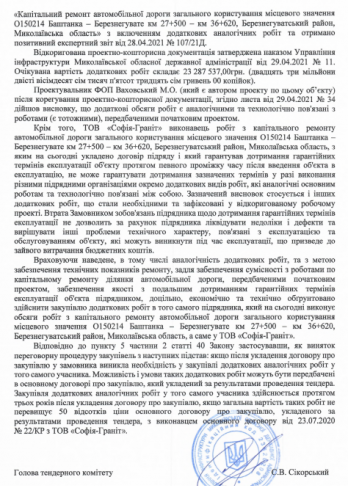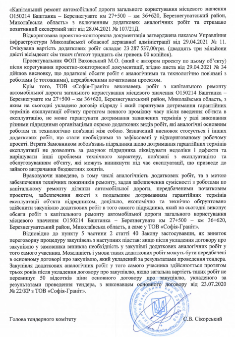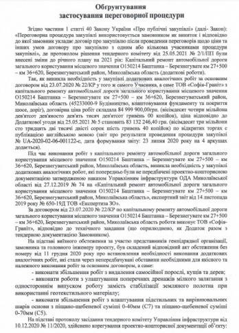 В описании нового тендера указано, что «возникла необходимость в закупке дополнительных аналогичных работ, которые предварительно были не предусмотрены проектно-сметной документацией, утвержденной приказом Управлением инфраструктуры ОГА Николаевской области».