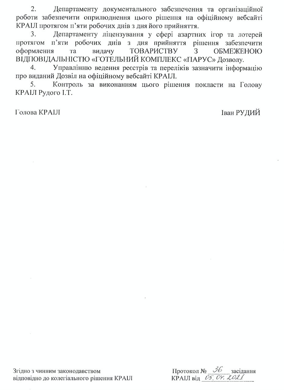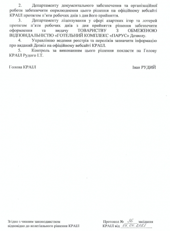 «Выдать ООО «Отельный комплекс «Парус» разрешение, которое подтверждает соответствие помещения для организации и проведения азартных игр в игорном заведении требованиям, установленным Законом Украины «О государственном регулировании деятельности по организации и проведению азартных игр», размещенного на первом этаже отеля «Рейкарц Ривер Николаев» по улице Спортивной, 9 общей площадью 318,8 м2 для организации и проведения азартных игр в залах игровых автоматов либо организации и проведения букмекерской деятельности в букмекерских пунктах», - говорится в документе.
