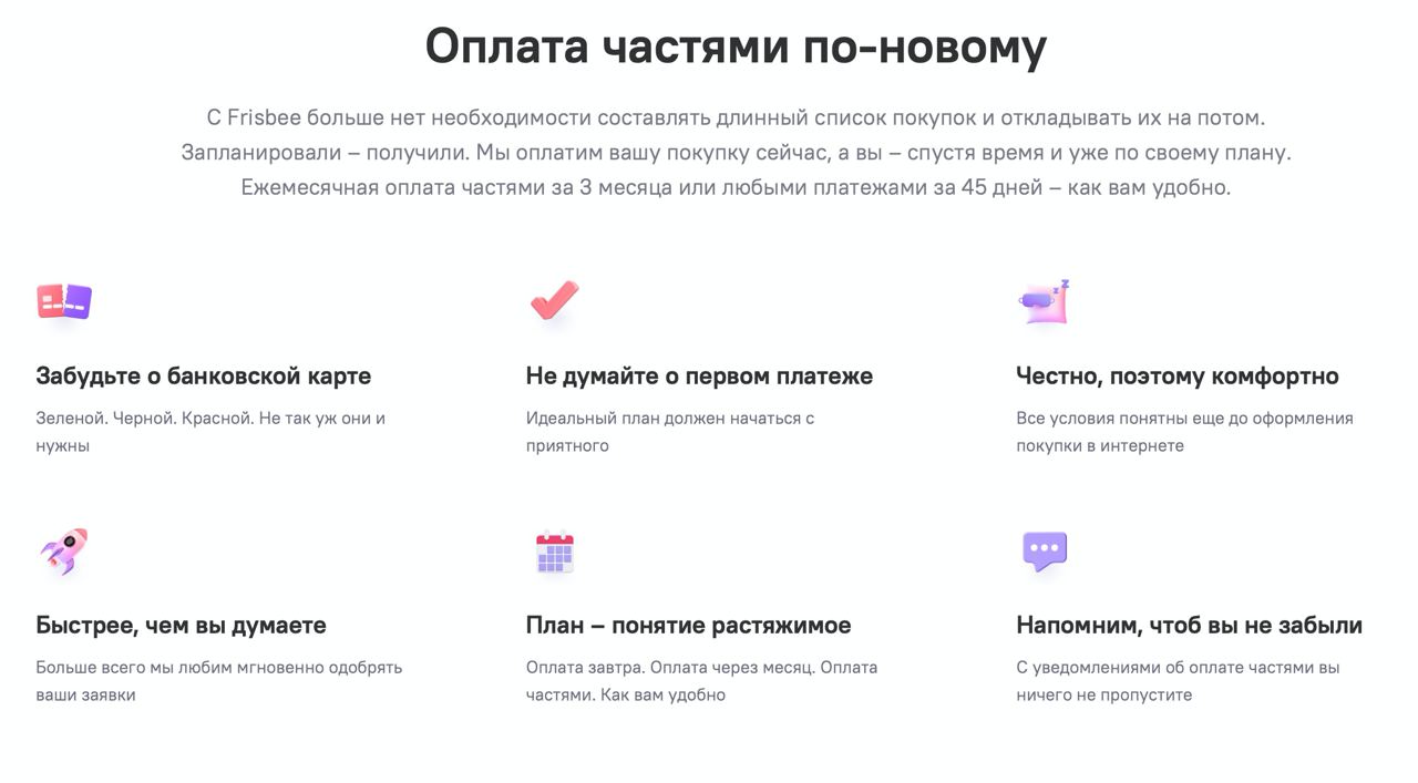 Как уже было сказано выше, удобство Frisbee в том, что сервис не диктует своих правил по графику оплаты по рассрочке. Сегодня вы просто делаете покупку в магазине или заказываете услугу и выбираете удобный для себя способ оплаты частями. Первый взнос нужно будет сделать только через месяц.