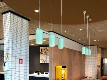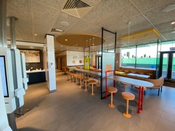 В ресторане восемь терминалов самообслуживания. Кассовая зона разделена на две части — для заказа и выдачи, сотрудники могут принести заказ за столик.