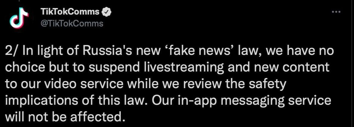 В свете нового российского закона о «фейковых новостях» у нас нет другого выбора, кроме как приостановить прямую трансляцию и новый контент для нашего видеосервиса, пока мы рассматриваем последствия этого закона для безопасности. Наша служба обмена сообщениями в приложении не будет затронута», - говорится в сообщении.