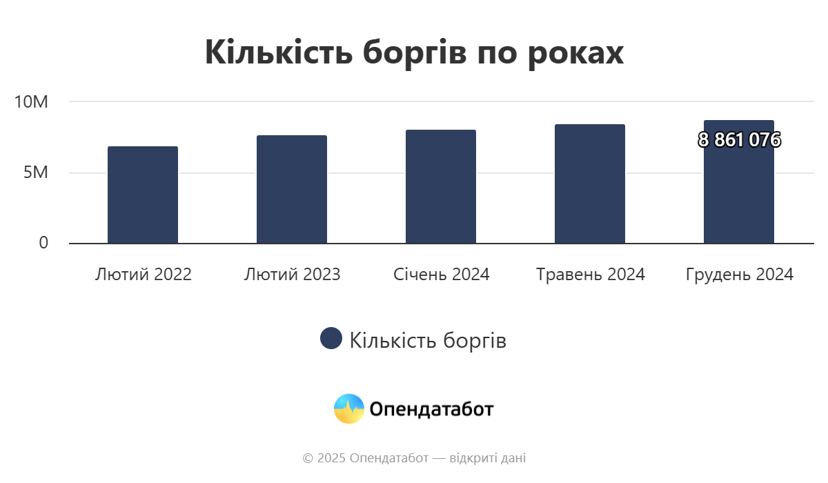 Усього в реєстрі боржників зараз налічується майже 9 мільйонів записів, про це свідчать аналітичні дані Опендатабот. Від початку повномасштабної війни реєстр зріс на майже 2 мільйони різних заборгованостей.
