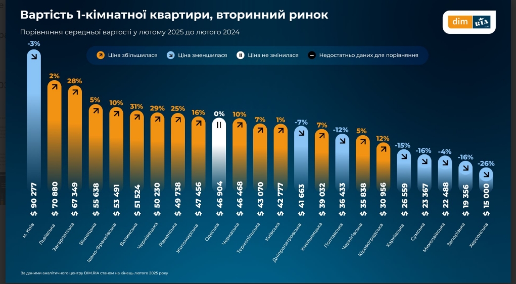 У лютому 2025 року в більшості регіонів України зросли ціни на вторинне житло, однак у Миколаївській області зафіксовано зниження вартості однокімнатних квартир на 1%.