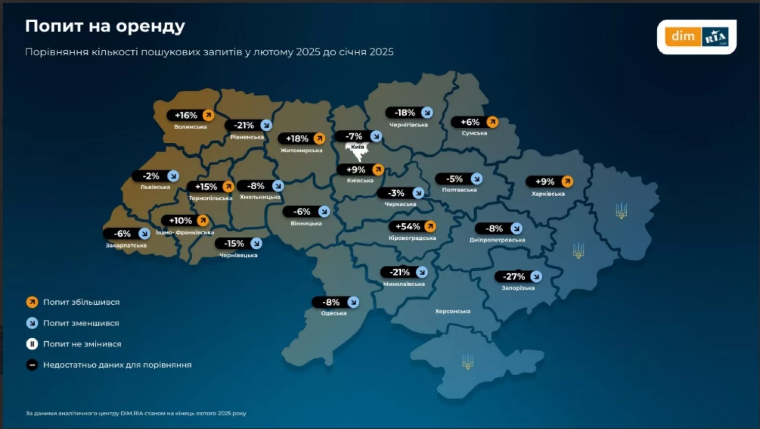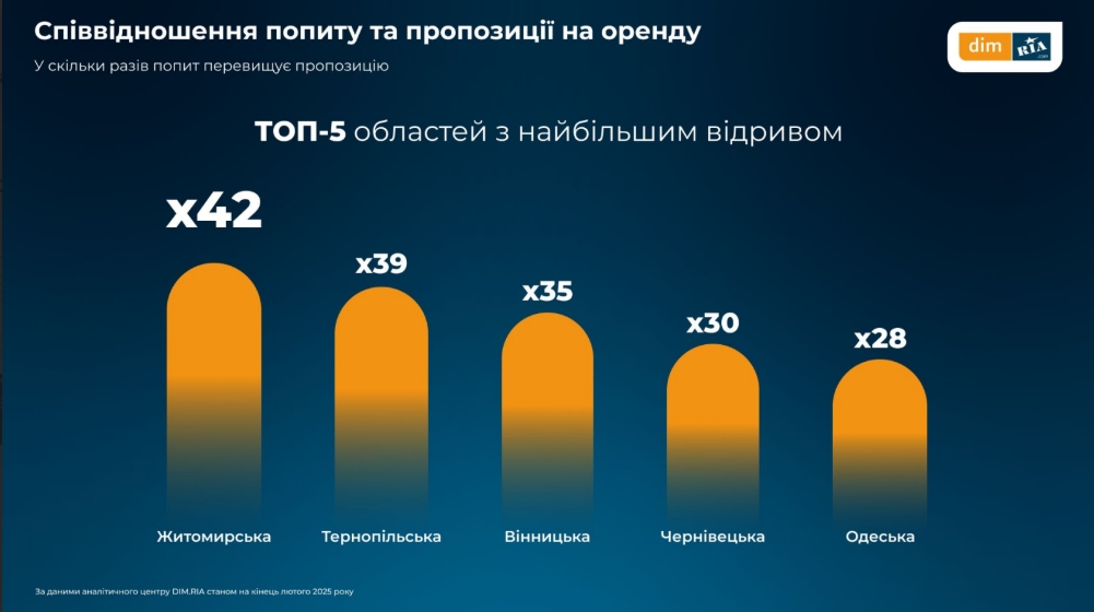 При цьому, найбільше зростання попиту спостерігалося у Кіровоградській, Житомирській, Волинській та Тернопільській та Одеській областях. Зокрема на Одещині попит перевищує пропозиції у 28 разів.