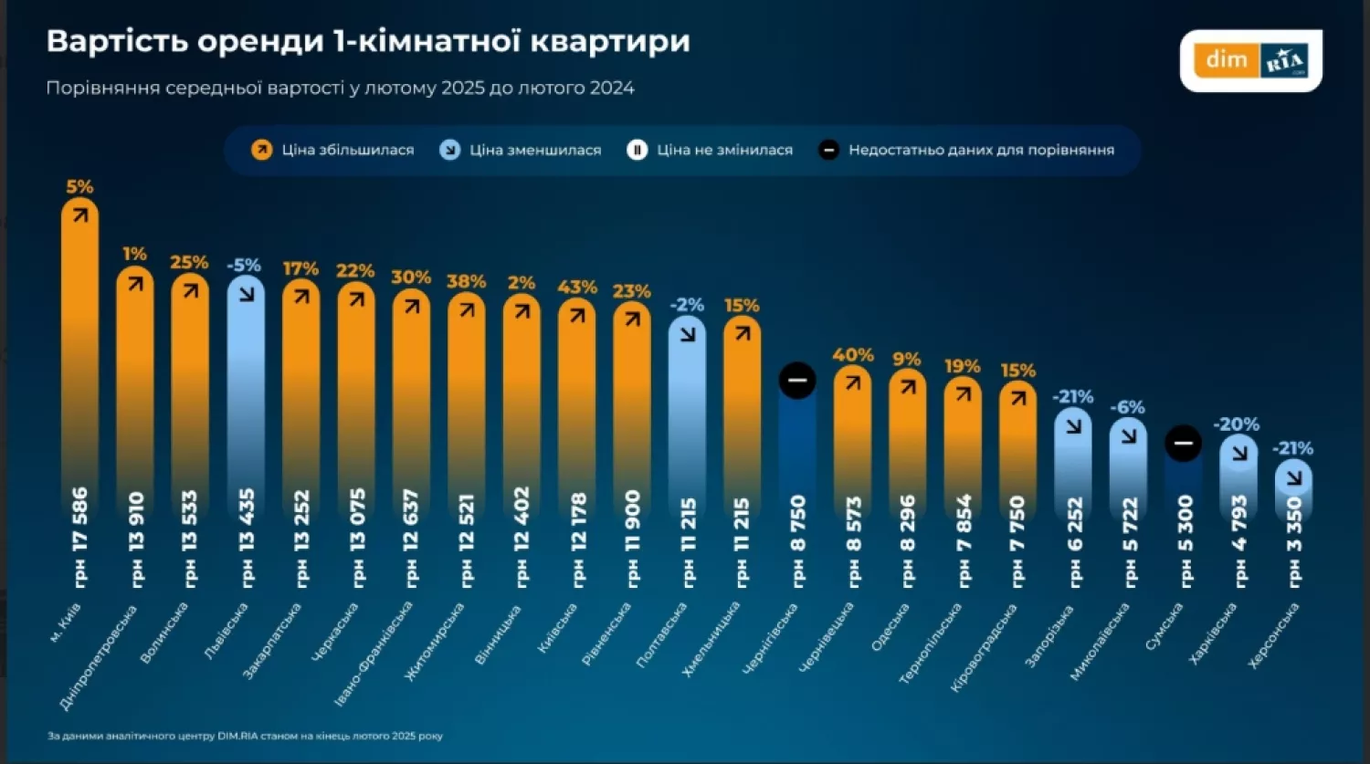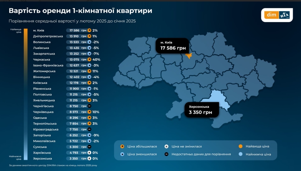 Найдорожче орендувати однокімнатну квартиру в лютому було в Києві — у середньому майже 17,6 тисячі гривень. У Дніпропетровській області власники просять майже 14 тисяч гривень, а у Волинській — понад 13,5 тисячі.