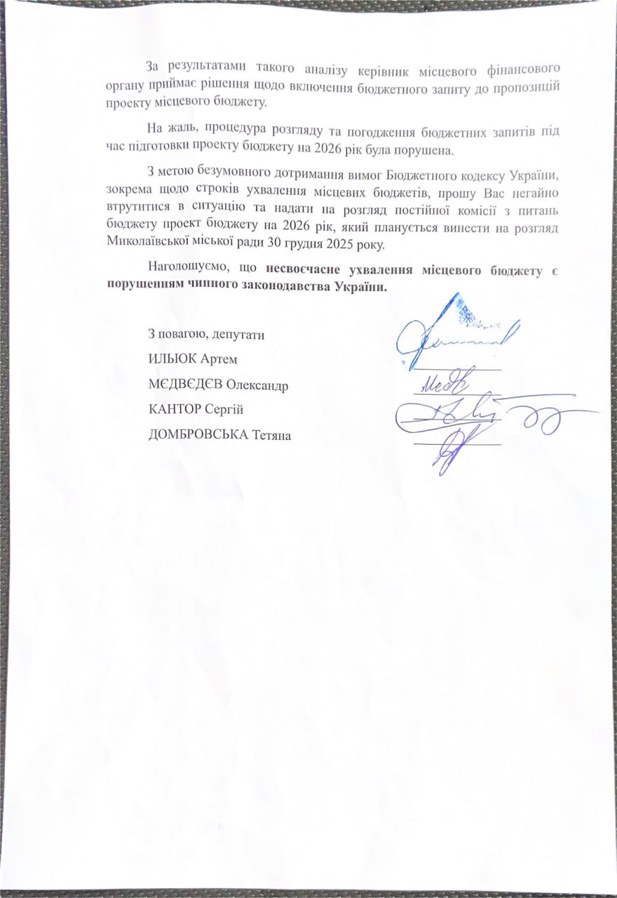 Окремо депутати звертають увагу на те, що під час розгляду бюджету до участі не був залучений директор Департаменту фінансів Миколаївської міськради. Вони вважають це порушенням Бюджетного кодексу України, адже саме керівник місцевого фінансового органу ухвалює рішення щодо включення бюджетних запитів до пропозицій проєкту місцевого бюджету.