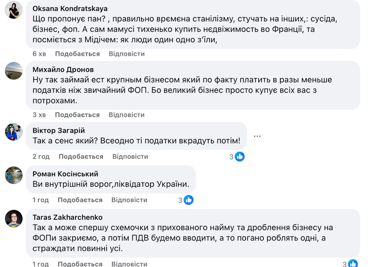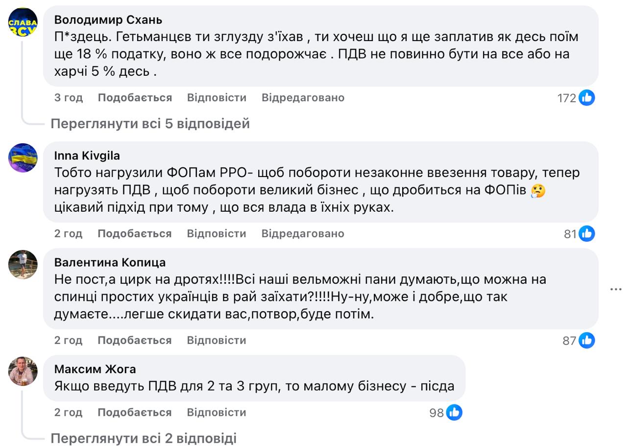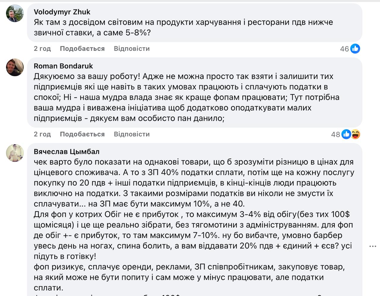 Ця публікація викликала значне обговорення у коментарях. Користувачі зазначають, що запровадження ПДВ для другої та третьої категорії ФОПів не вирішує проблему зловживань з боку великого бізнесу та жодним чином не вплине на контрабанду, боротьбу з якою декларує Мінфін цим законопроєктом. Українці наголошують, що нововедення ставить під загрозу увесь середній та малий бізнес, який наразі функціонує в країні попри значні виклики.
