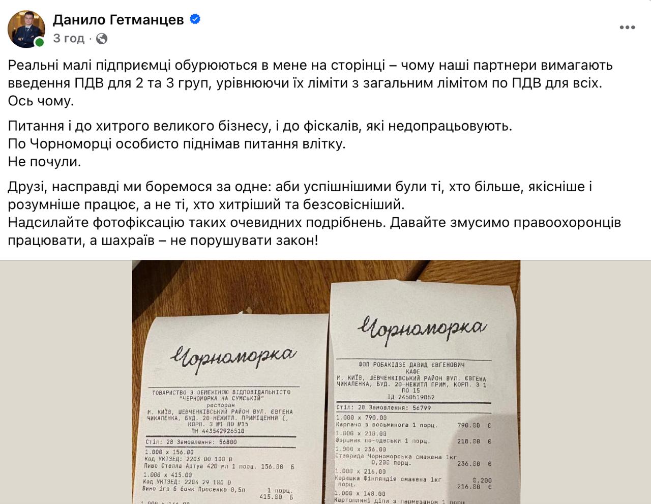 Як приклад він привів мережу кафе «Чорноморка», яку раніше звинувачував в ухилянні від сплати податків. За словами депутата, у закладах мережі застосовували схеми з «р2р»-платежами, подрібненням чеків та видачею неофіційних квитанцій. Тоді ще Данило Гетманцев закликав власників самостійно виправити порушення, щоб не повторити долю мережі ресторанів GAGA, де після 36 перевірок ДПС нарахували штрафів на близько 7 мільйонів гривень і анулювали ліцензії на алкоголь.