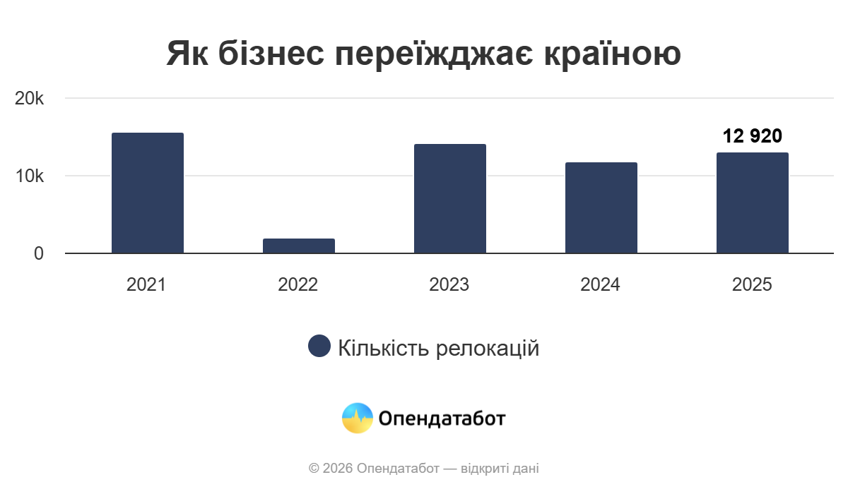 У 2025 році в Україні зафіксували майже 13 тисяч переїздів бізнесу — це на 11% більше, ніж у 2024-му, проте все ще менше, ніж до початку повномасштабної війни. Деякі компанії змінювали місце реєстрації кілька разів протягом року.