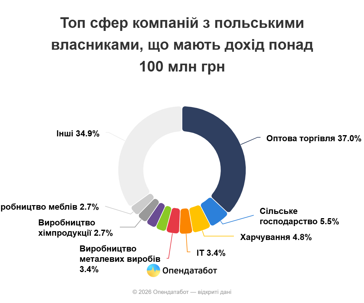 Найбільша частка польських компаній із доходом понад 100 мільйонів гривень працює у сфері оптової торгівлі — 54 підприємства. Також серед лідерів за кількістю бізнесів — аграрний сектор (8 компаній), сфера харчування (7), ІТ та виробництво металевих виробів — по п’ять компаній у кожній галузі.
