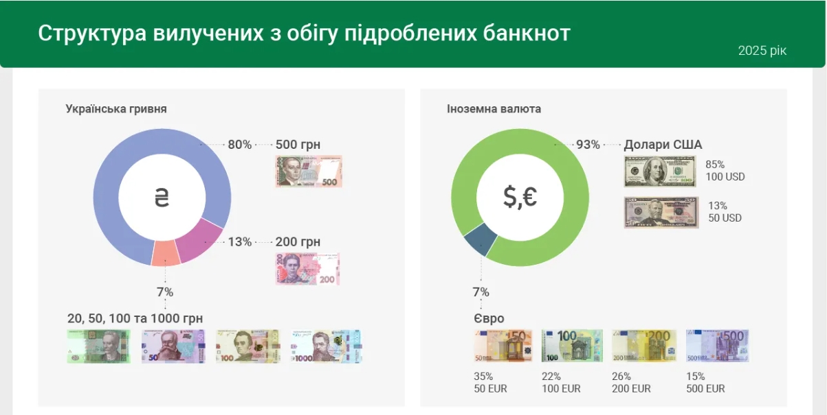 Також у 2025 році зменшилася кількість підробок іноземної валюти — приблизно на чверть. Найчастіше фальшували долари США (93% випадків), рідше — євро (7%).