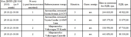В частности, Нацбанк купил 3 автомобиля Toyota Avensis 2,0 CVT по цене 293500 гривен за один автомобиль, 4 автомобиля Toyota Corolla 1,6 6MT Luna по цене 198400 гривен, 4 микроавтобуса Volkswagen T5 Kombi "за 406, 2 тысячи гривен, а также 2 микроавтобуса Volkswagen Caravelle "по цене 529900 гривен за единицу.