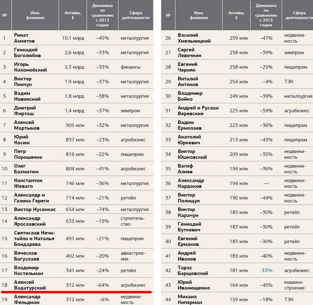 Только 5 участников рейтинга (среди них экс-мэр Киева Леонид Черновецкий) за минувший год нарастили активы. Остальные считают потери. В абсолютных цифрах больше всех за год потерял Ринат Ахметов - $8,1 млрд. Эта потеря сопоставима с суммарной стоимостью активов Виктора Пинчука (№5), Юрия Косюка (№8) и трех мультимиллионеров группы Приват (Геннадия Боголюбова №2, Игоря Коломойского №3 и Алексея Мартынова, №7) вместе взятых.