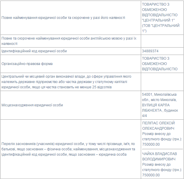 Учредителями ООО «Центральный 1» являются известные в городе личности: Алексей Пелипас и сын покойного мэра Владислав Чайка, которые вложили в уставной фонд предприятия по 750 тысяч гривен.