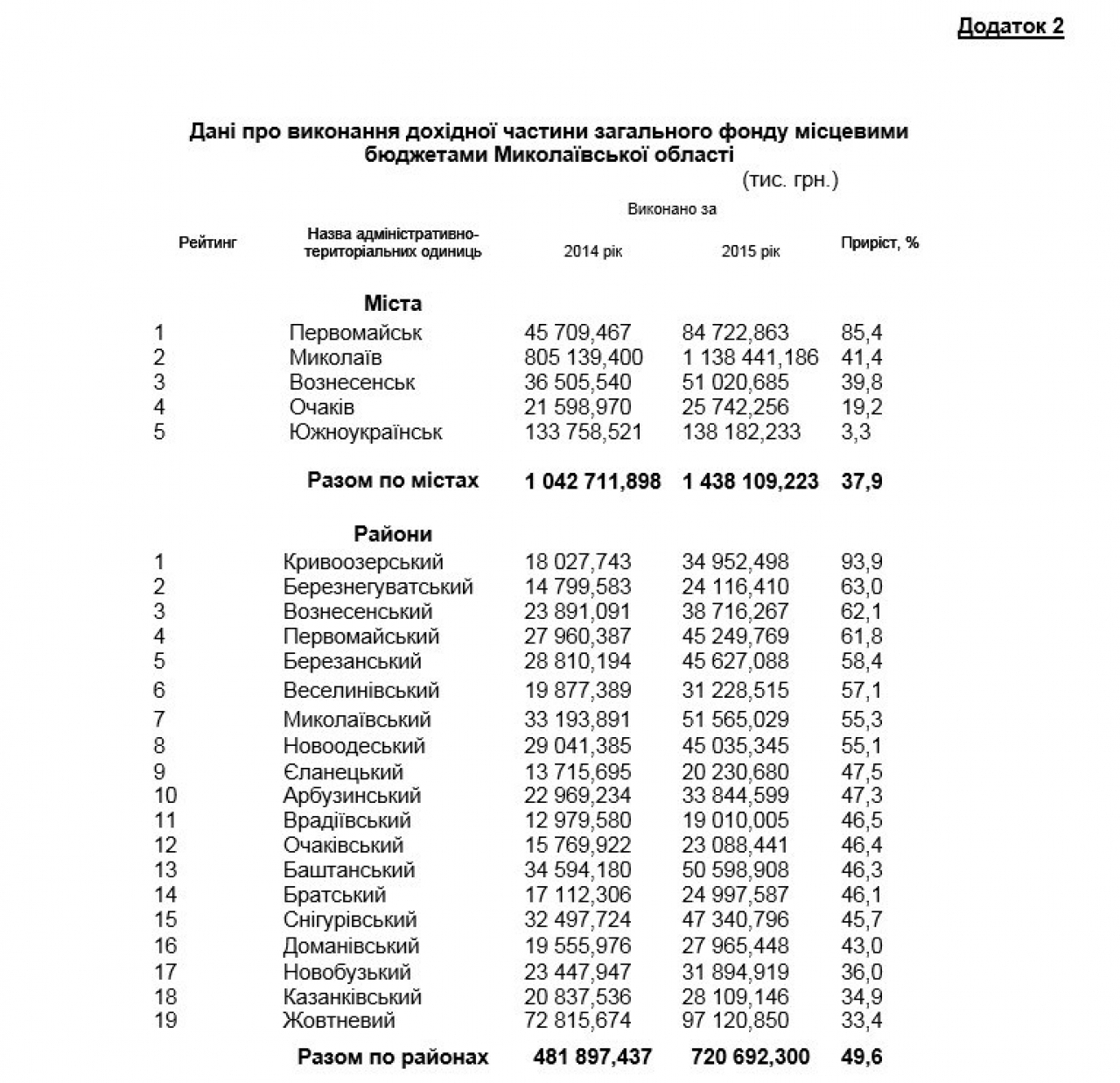 Что касается показателей выполнения доходной части общего фонда местных бюджетов за 2015 год, то 1 место занимает Первомайск, где прирост составил 85,4%, 2 место - Николаев (41,4%), 3 место - Вознесенск (39,8%), 4 место - Очаков (19,2%), 5 место - Южноукраинск (3,3%).