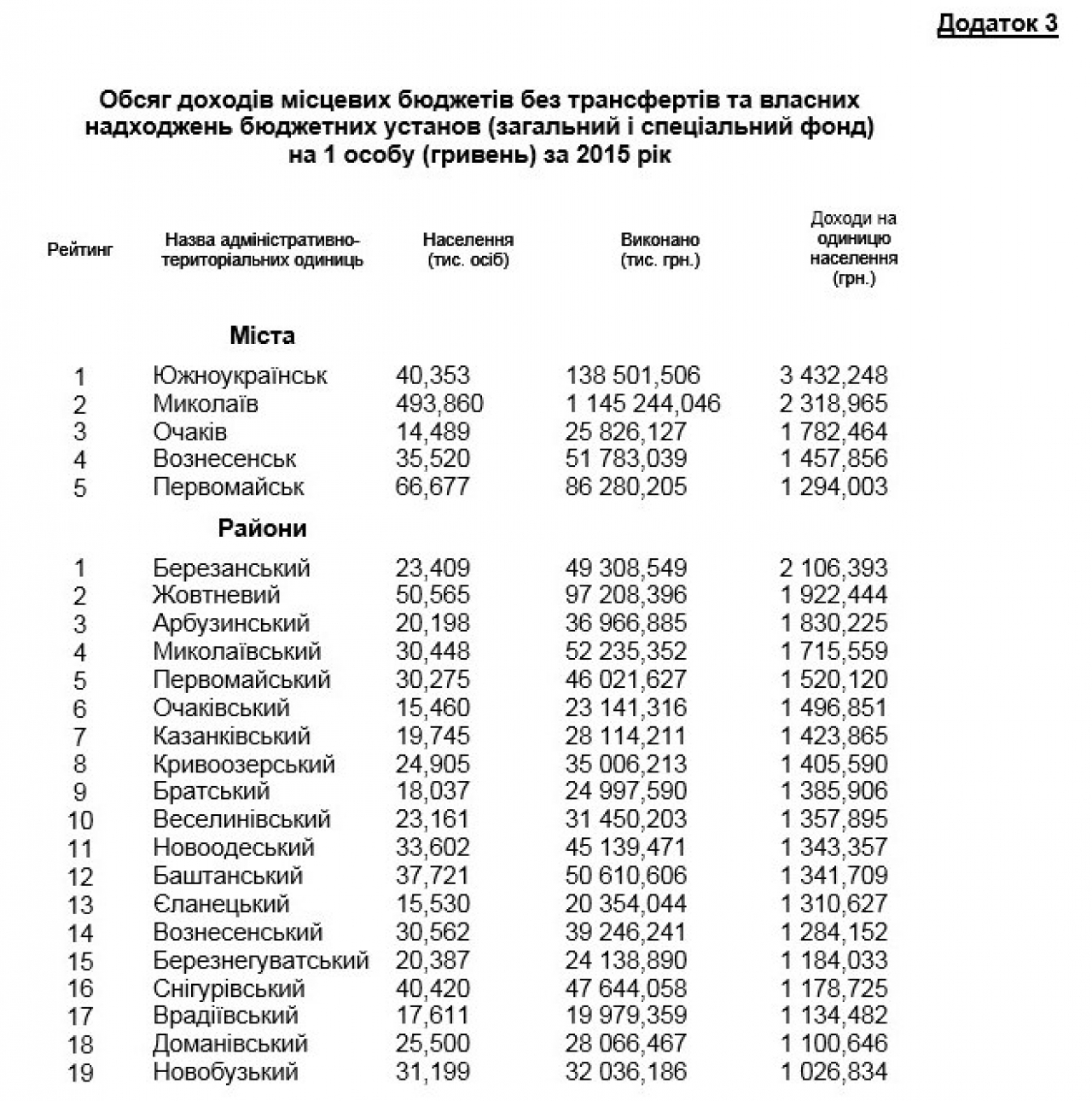 По показателю объема доходов местных бюджетов без трансфертов и собственных поступлений бюджетных учреждений (общий и специальный фонд) на одного человека 2015 года на первом месте Южноукраинск - 3432 гривны, на втором месте Николаев - 2318 гривен, на третьем месте Очаков – 1782 грн., на четвертом месте Вознесенск – 1457 грн. Завершает рейтинг Первомайск с показателем 1294 гривны на одного человека.