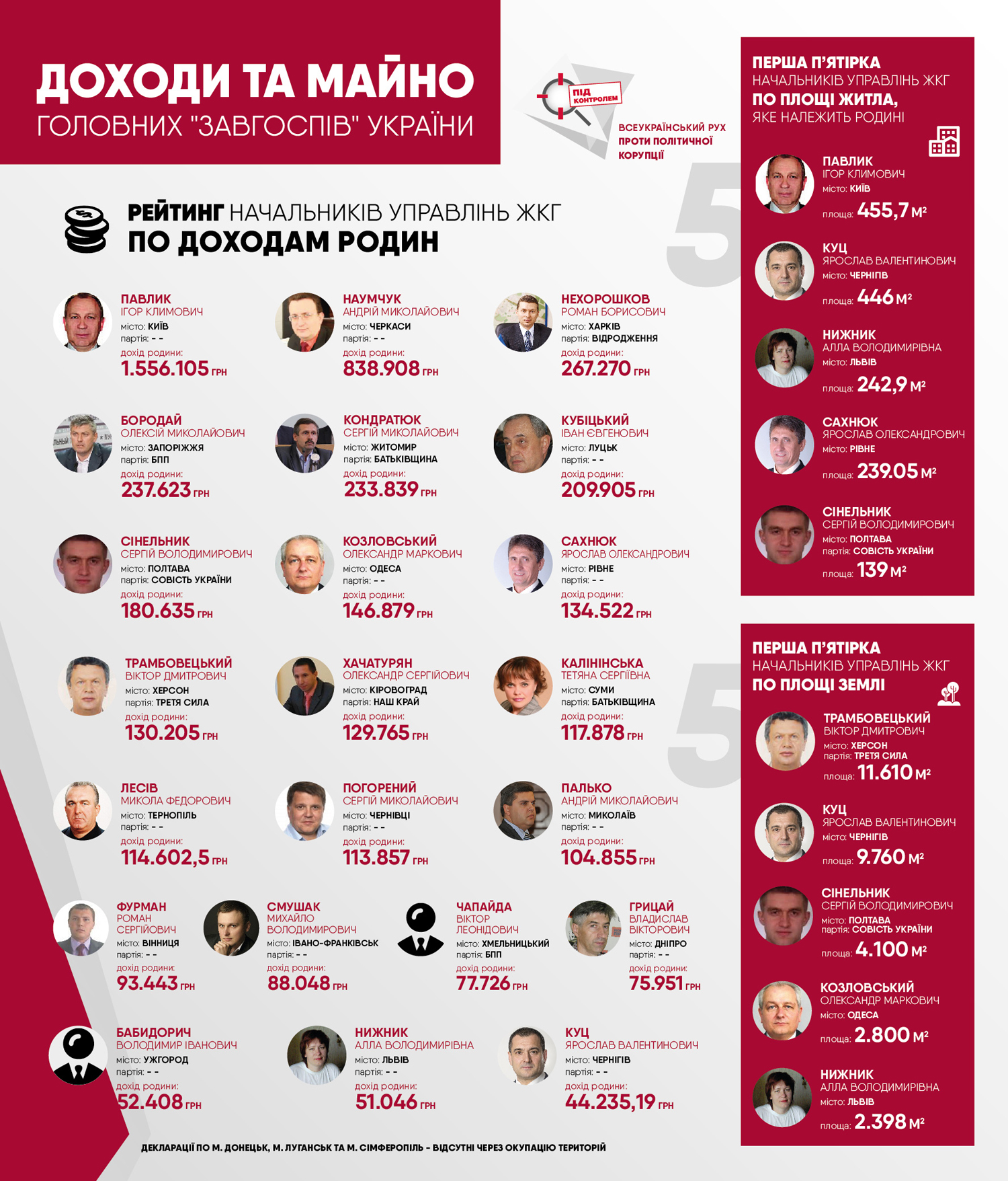 Рейтинг доходов возглавил директор столичного департамента ЖКХ Игорь Павлик, доход его семьи в прошлом году составил более 1,5 миллионов гривен. Вторым в рейтинге доходов оказался Андрей Наумчук, опытный коммунальщик из Черкасс. В 2015 году семья Наумчука заработала более 800 тысяч гривен. На третьем месте с большим отрывом в рейтинге доходов оказался харьковчанин Роман Нехорошков, также известный как депутат Харьковского горсовета от «Возрождения» Геннадия Кернеса. В 2015 году Нехорошков заработал чуть более четверти миллиона гривен. Ездит чиновник на Toyota Venza 2010 года.