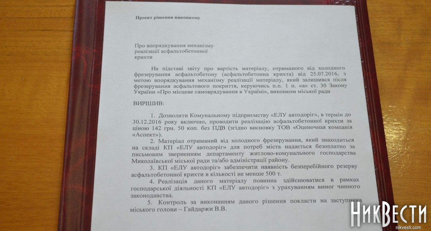 В решении исполкома прописано, что предприятие может продавать асфальтобетонную крошку до 30 декабря 2016 года включительно. Кроме того, «ЭЛУ автодорог» обязали бесплатно предоставлять материал, полученный от холодного фрезерования, департаменту ЖКХ и районным администрациям Николаева после соответствующего письменного обращения.