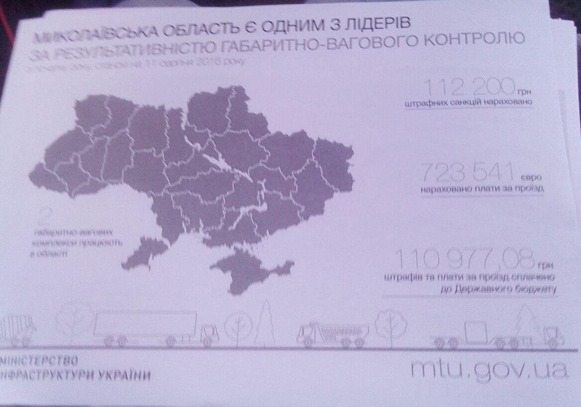 Судя по инфографике, предоставленной министерством, с начала года в Николаевской области на перевозчиков наложено 112 200 гривен штрафных санкций. Из них 110 977 штрафов оплачено в Государственный бюджет. Кроме того, на 723 541 евро начислено платы за проезд.