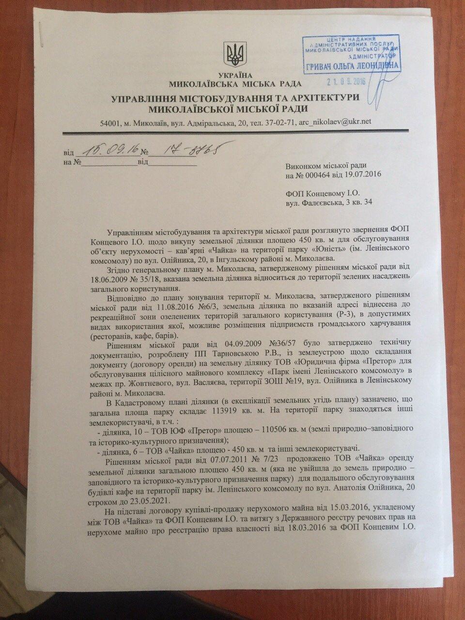 Об этом речь идет в ответе управления градостроительства и архитектуры Николаевского городского совета на заявление ФОП Концевого И. А. по поводу выкупа земельного участка в парке «Юность».