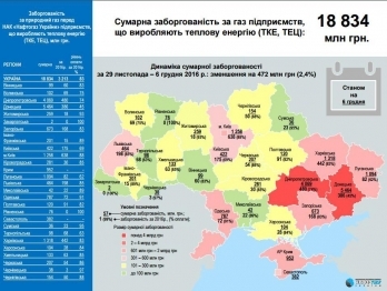 В отчете сказано, что суммарная просроченная задолженность перед НАК «Нафтогаз Украины» предприятий ТКЭ и ТЭЦ за природный газ, использованный для производства тепловой энергии, составляет около 18, 8 миллиардов гривен, из них за 2016 – 3, миллиарда гривен. За прошедшую неделю задолженность уменьшилась на 472 миллиона гривен (2,4%).