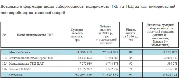 По состоянию на 6 декабря текущего года суммарная просроченная задолженность предприятий ТКЭ, ТЭЦ и прямых промышленных потребителей перед НАК «Нафтогаз Украины» составляет около 23 миллиардов гривен. Теплогенерирующие предприятия Николаевщины задолжали НАК «Нафтогаз» в общей сложности порядка 42 миллионов гривен.