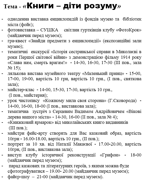 Николаевский областной краеведческий музей приглашает горожан и гостей Николаева на ежегодную акцию «Ночь в музее», которая состоится 20 мая 2017 года с 14:00 до 22:00.