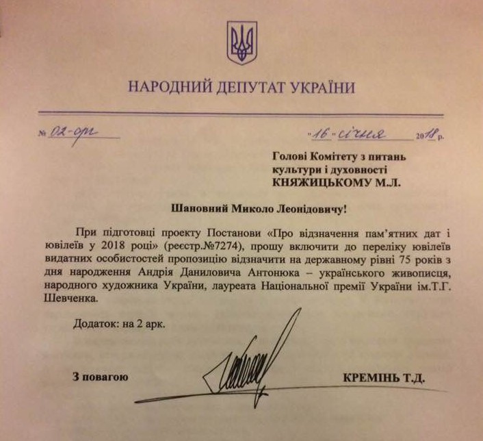 В четверг, 8 февраля, Верховная Рада Украины 228-ю голосами поддержала Постановление «О праздновании памятных дат и юбилеев в 2018 году», куда включили 75-летие со дня рождения народного художника Украины Андрея Антонюка.