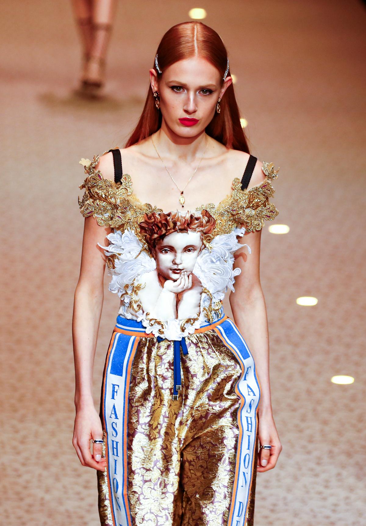 Декорации шоу — оммаж скульптурному оформлению оратория при церкви Санта Чита в Палермо, выполненному в любимой Дольче и Габбаной барочной стилистике.
