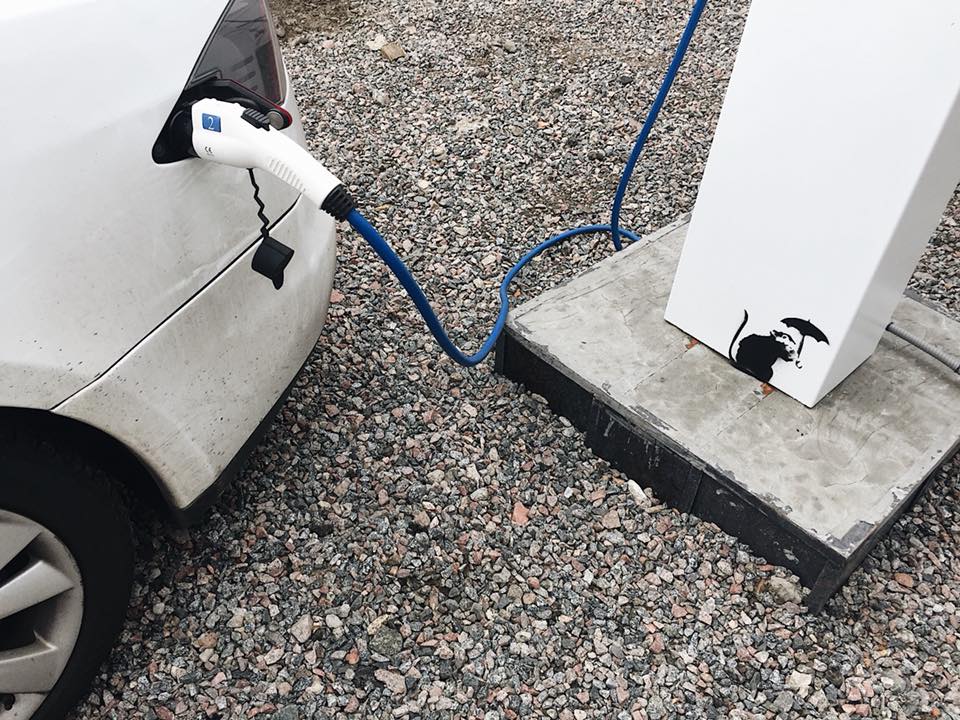 На трафаретном рисунке, который подписан тегом Бэнкси, изображен «двуглавый» орел с топливо-раздаточными пистолетами вместо голов, сидящий на ветке. На самой электрозаправке нарисовали крысу под зонтиком.