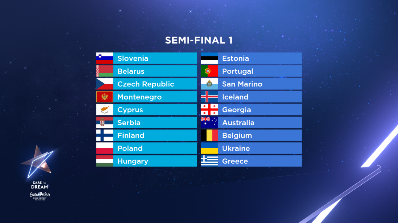 В первом полуфинале 14 мая выступят Словения, Беларусь, Чехия, Черногория, Кипр, Сербия, Финляндия, Польша, Венгрия, Эстония, Португалия, Сан-Марино, Исландия, Грузия, Австралия, Бельгия, Украина, Греция.
