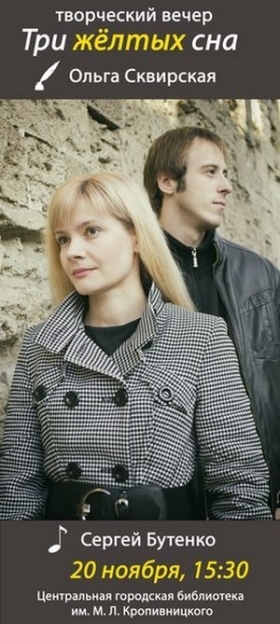 «Три желтых сна» - так называется творческий вечер николаевского поэта Ольги Сквирской, на котором она представит свои старые и новые стихи, а также познакомит со своей прозой, которую будет впервые читать на публике. Также на вечере самостоятельно и в качестве сопровождения к текстам прозвучат пьесы для фортепьяно музыканта Сергея Бутенко.