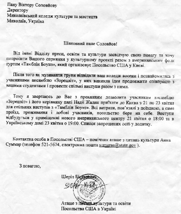 Официальное приглашение для участия в концерте от Атташе по вопросам культуры и образования Посольства США в Украине Шерил Бистрянски поступило после творческой встречи фолк-группы «Тамблин Боунс» с ансамблем, которая состоялась в ноябре этого года в колледже культуры. Американские исполнители были поражены профессиональным исполнением украинских народных песен студентами колледжа и сразу решили создать совместный творческий проект.
