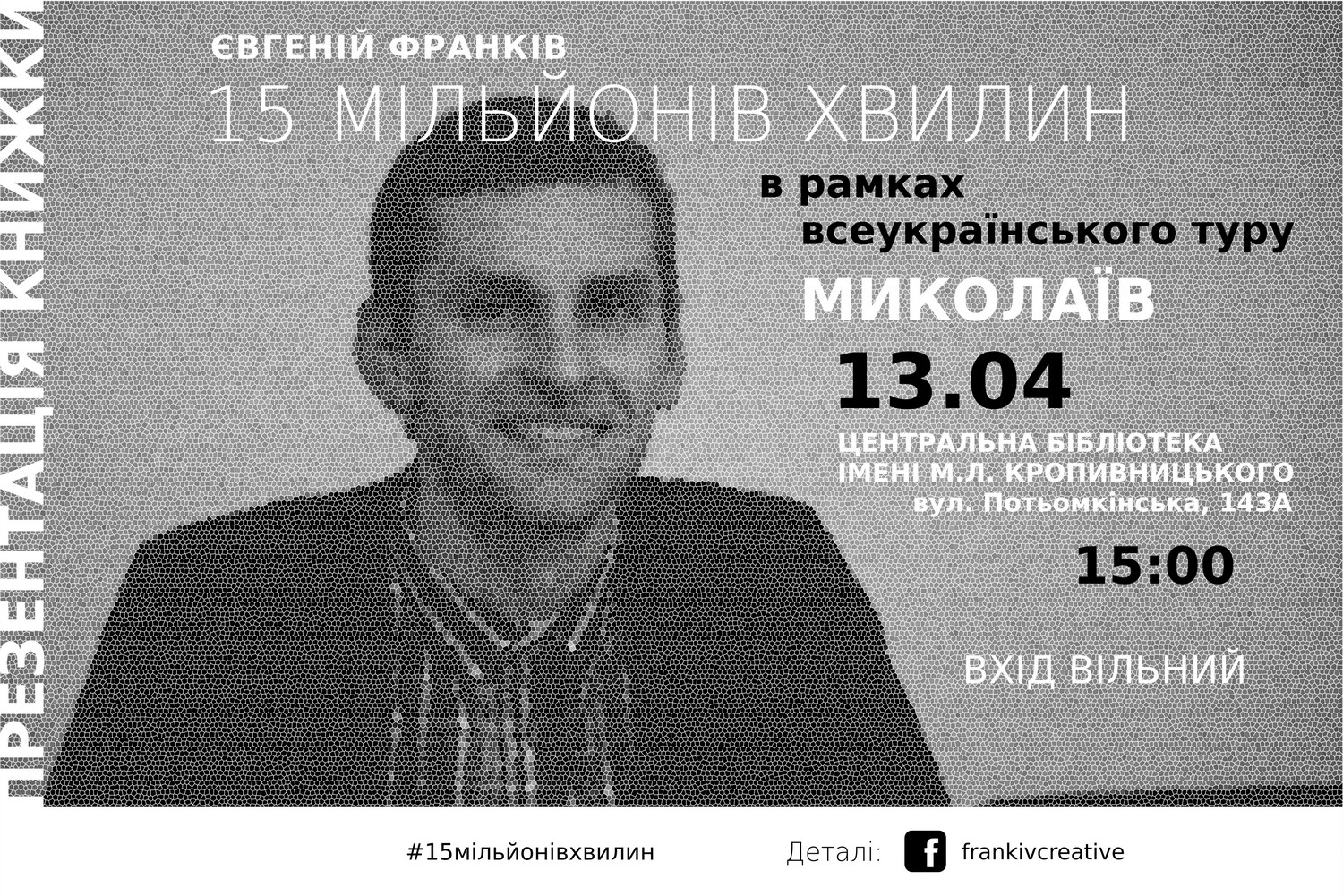 В рамках всеукраинского тура Николаев впервые посетит автор из Ровно Евгений Франкив со своим поэтическим сборником «15 мільйонів хвилин». Евгений является общественным деятелем, работает в сфере образования, занимается музыкой, путешествует и имеет много увлечений.