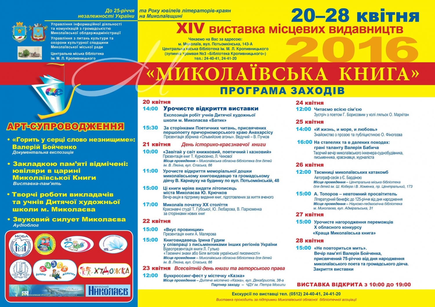 С 20 по 28 апреля в Николаеве пройдет XIV выставка местных изданий «Николаевская книга». Открытие состоится в среду, в 14:00, в Центральной городской библиотеке имени Марка Кропивницкого.