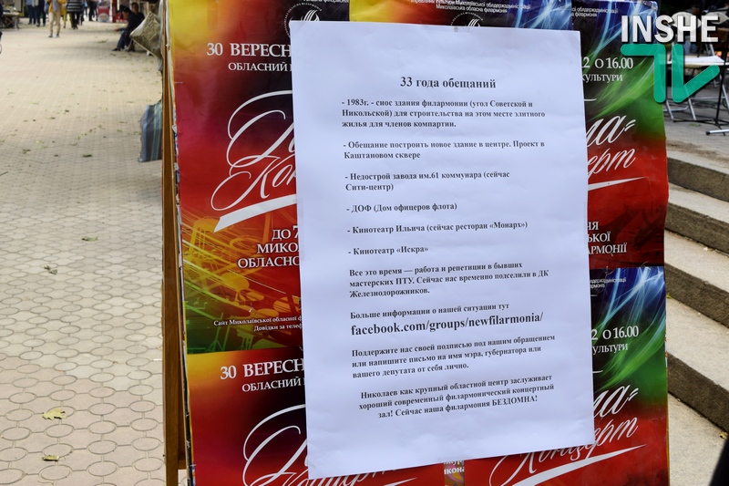 Во время акции-концерта горожане не только слушали классическую музыку в исполнении профессионалов, но и слышали о 33-летней истории обещаний Николаевской областной филармонии, передает Inshe.tv.