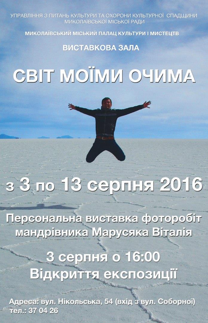 В среду, 3 августа, в выставочном зале Николаевского городского дворца культуры и искусств (улица Никольская, 54, вход со стороны Соборной) состоится открытие персональной выставки фоторабот путешественника Виталия Марусяка «Мир моими глазами».