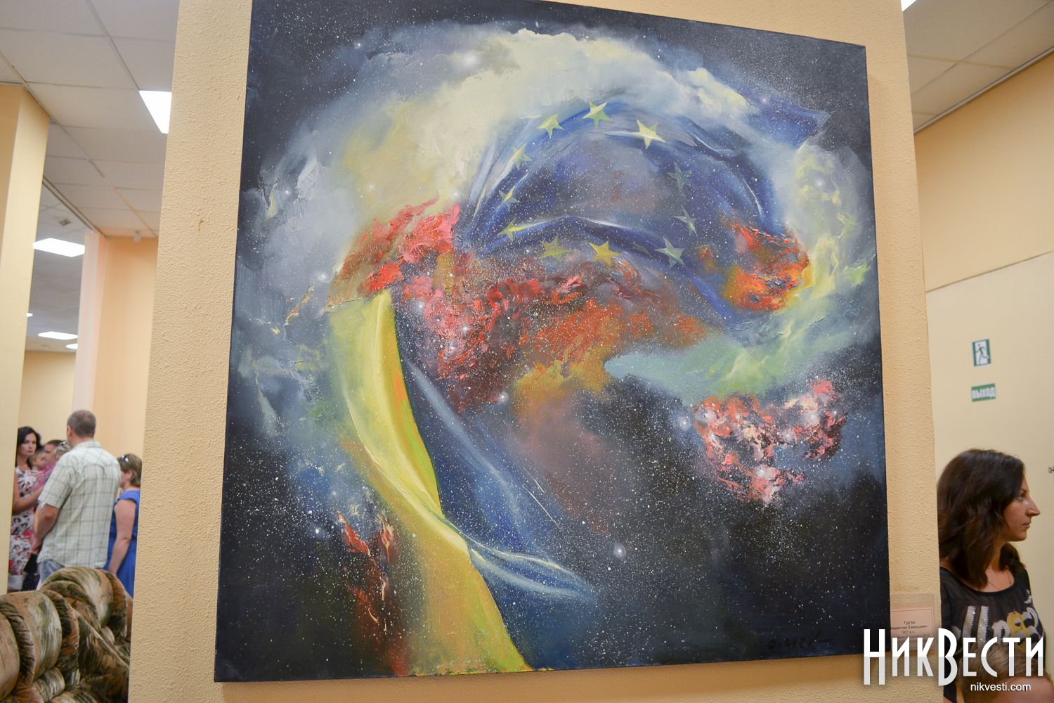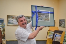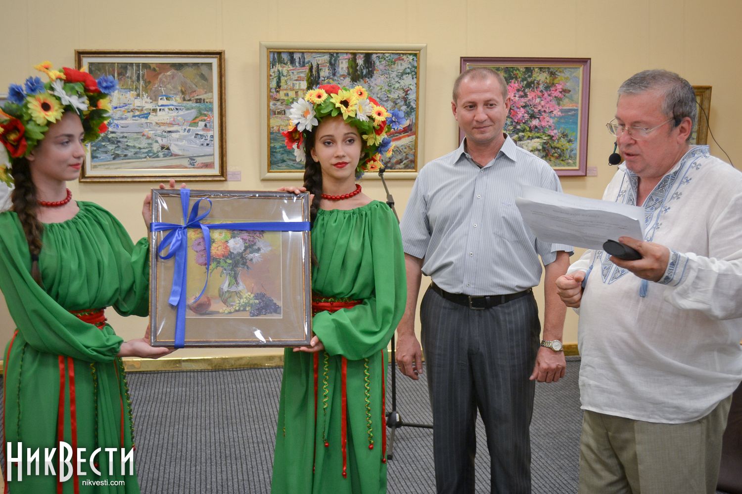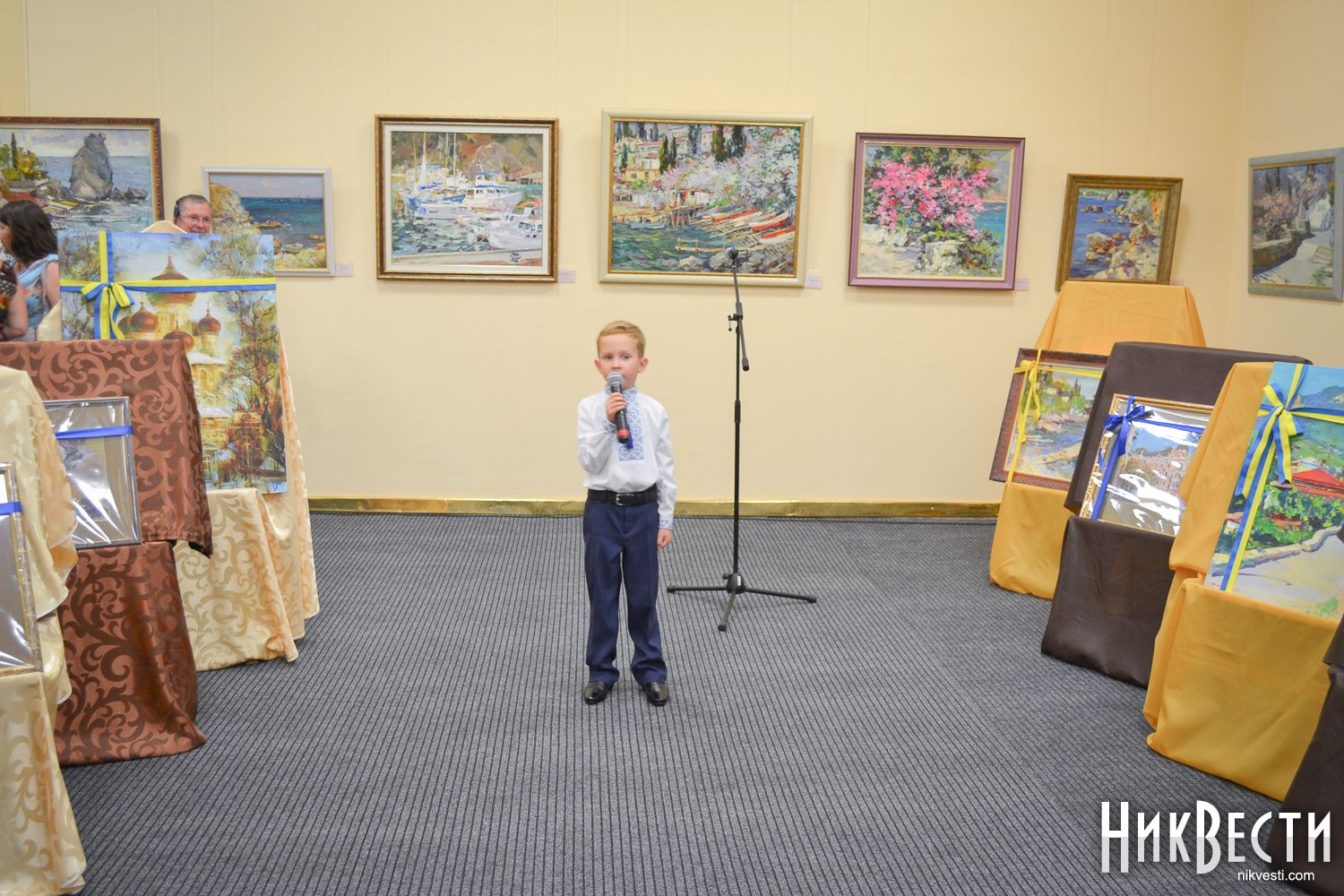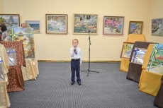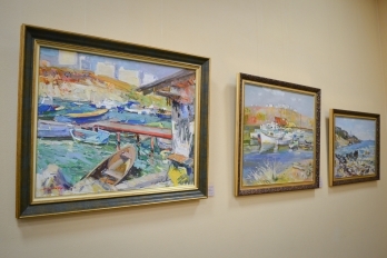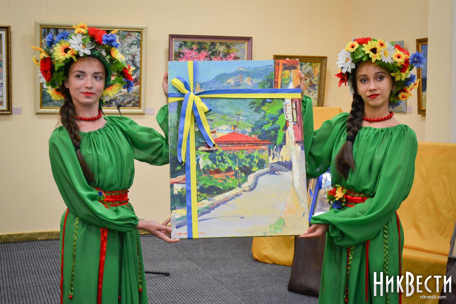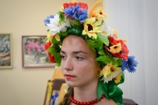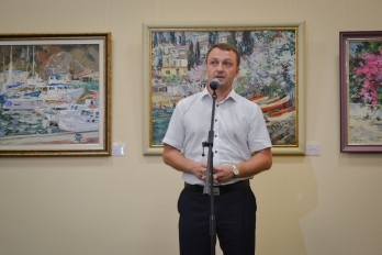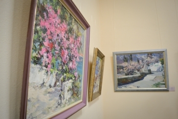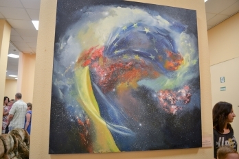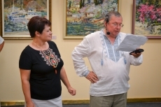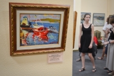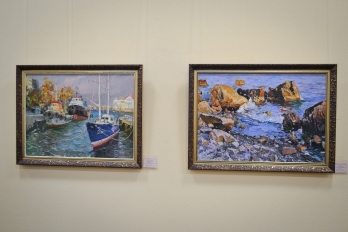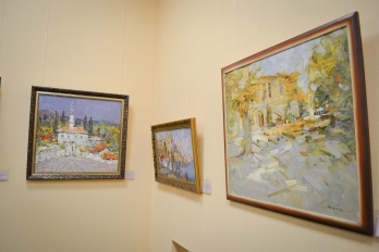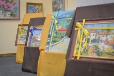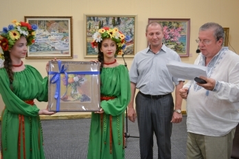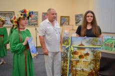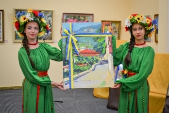 После уличного концерта гостей пригласили внутрь зала посмотреть на большую экспозицию из 80 работ 20 украинских художников. Среди мастеров кисти - пятеро заслуженных художников Украины: Николай Дудченко, Иван Тюха, Александр Чередниченко, Леонид Заборовский и Сергей Шаповалов.