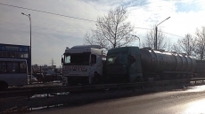Столкновение произошло в районе строительного супермаркета «Эпицентр». Оба грузовые автомобиля с цистернами двигались в направлении города.