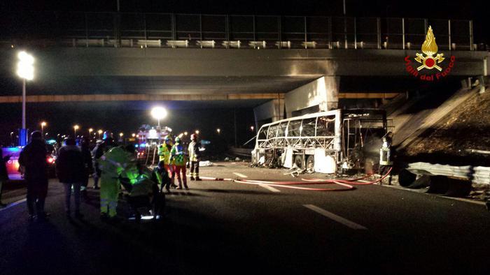 Авария произошла на шоссе в Вероне, когда автобус двигался по направлению к Венеции. Как утверждают сотрудники экстренных служб, транспортное средство врезалось в столб, после чего загорелось.