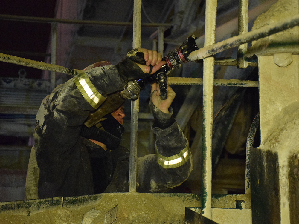 По прибытию было установлено, что горит зерновая пыль на загрузочной машине ПМ-700-У1 и очаги огня наблюдаются сразу в нескольких местах. Отделением пожарной охраны Николаевского морского порта были приняты первоочередные меры по тушению пожара, однако из-за труднодоступности к местам, где возникло возгорание, и из-за скопления большого количества горючего материала (зерновой пыли) тление продолжалось. Существовала угроза уничтожения оборудования - загрузочной машины.